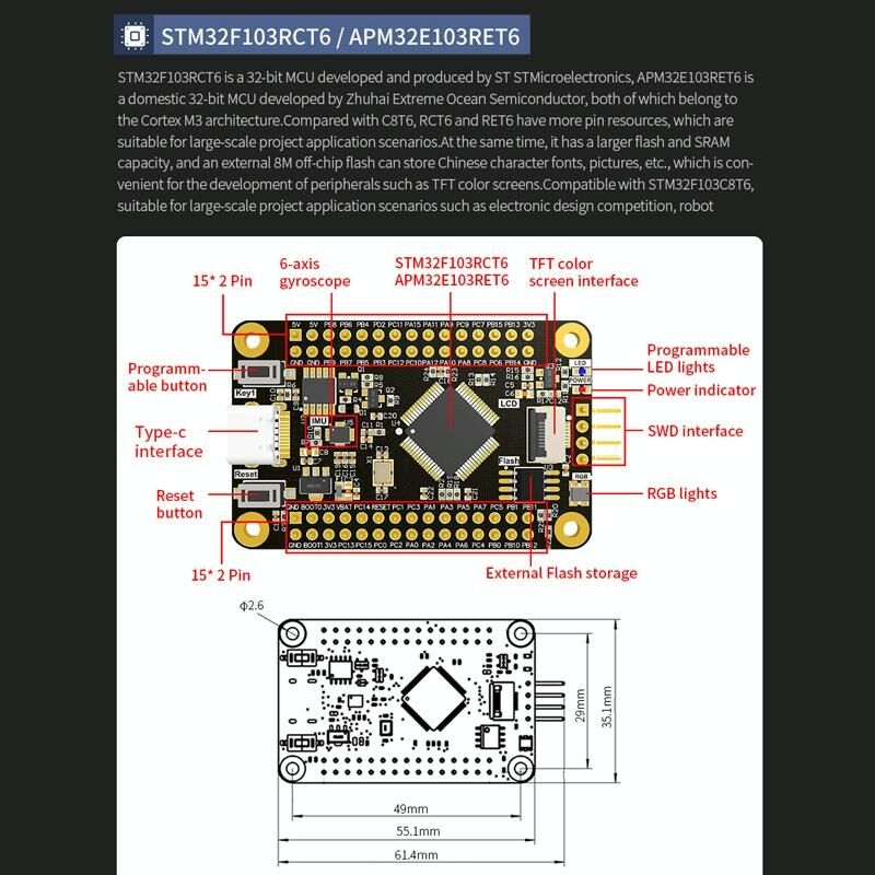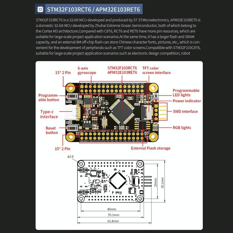 6. The board is equipped with STM32 small system circuit, among which STM32F103RCT6 and APM32E103RET6 are also equipped with a 6-axis IMU on board, which can be used to obtain motion attitude
