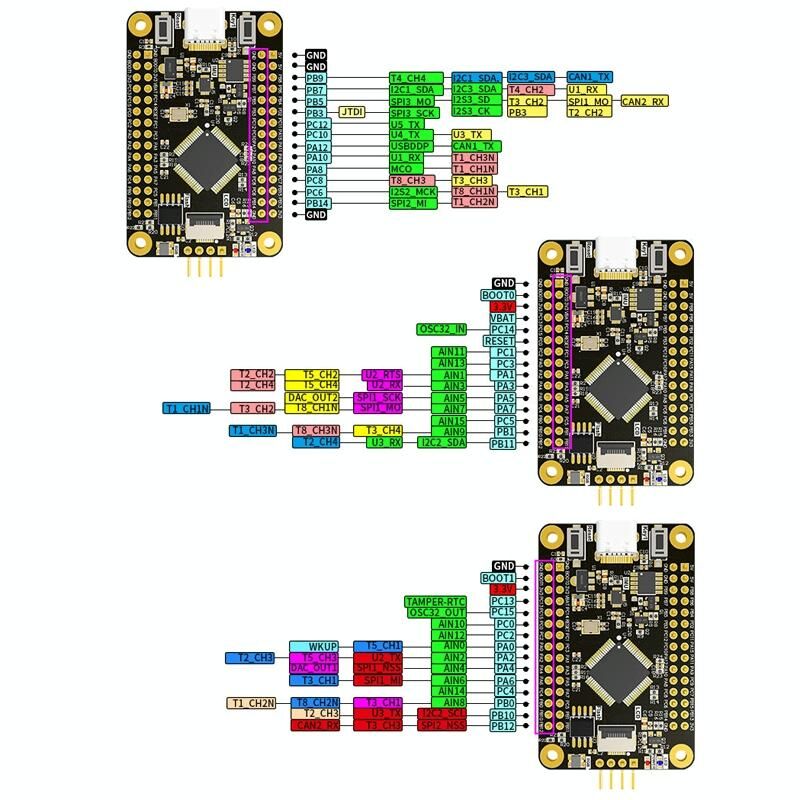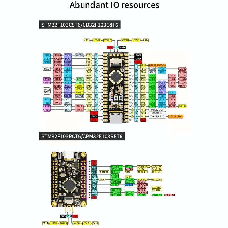 4. STM32F103RCT6: Contains all the pins of STM32F103C8T6 and some other peripheral pins, which can directly use the STM32 large-capacity standard library