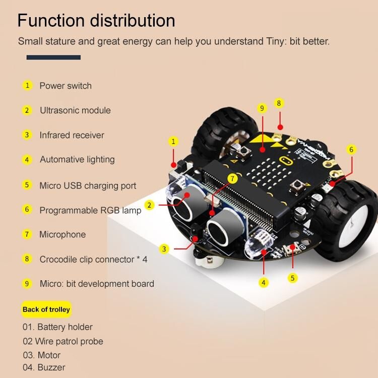 3. Το Tiny:bit είναι ένα ρομποτικό αυτοκίνητο για την εκπαιδευτική αγορά micro:bit. Είναι συμπαγές, εύκολο στη συναρμολόγηση και εύκολο στην κίνηση σε στενούς χώρους. Το έξυπνο αυτοκίνητο Tiny:bit βασίζεται στο σχεδιασμό της πλακέτας ανάπτυξης micro:bit και χρησιμοποιεί τον διαδικτυακό προγραμματισμό κώδικα του MakeCode και της Python. Οι πλούσιες εφαρμογές αισθητήρων επιτρέπουν στο Tiny:bit να αλληλεπιδρά εύκολα. Το έξυπνο αυτοκίνητο Tiny:bit έχει ένα σετ κλιπ αλιγάτορα στο πίσω μέρος που μπορούν να είναι δημιουργικά και να επεκταθούν.