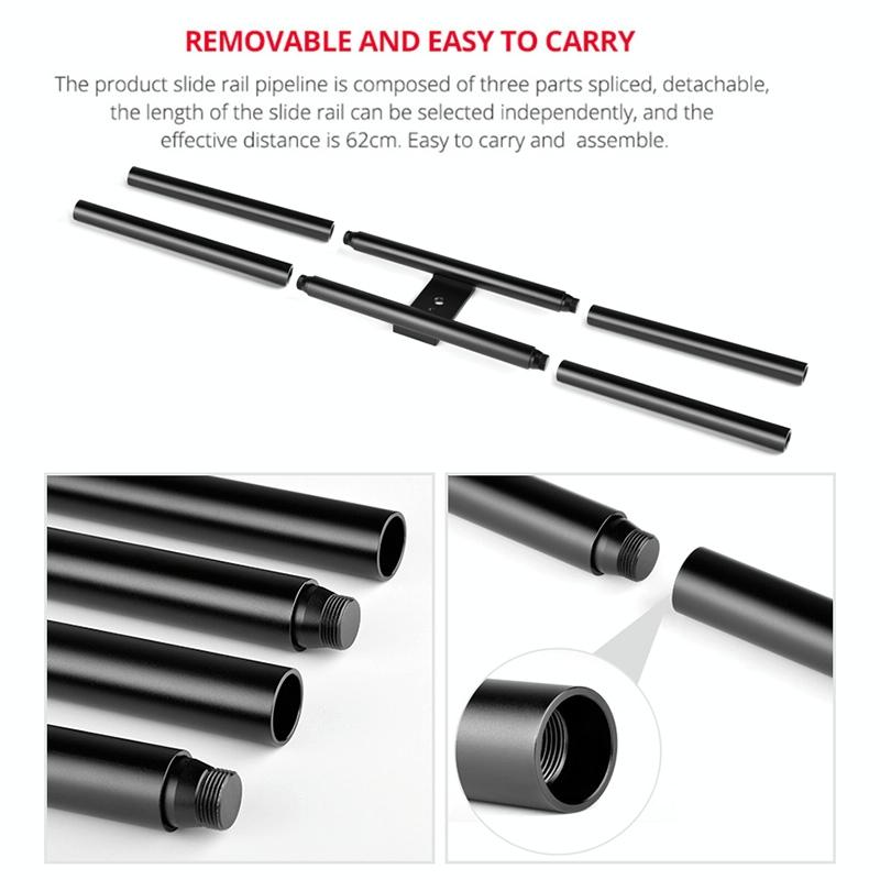 14. The product slide rail pipe is spliced a??a??into three parts, which can be disassembled. The length of the slide rail can be independently selected, and the effective stroke is 62cm. Portable and easy to assemble