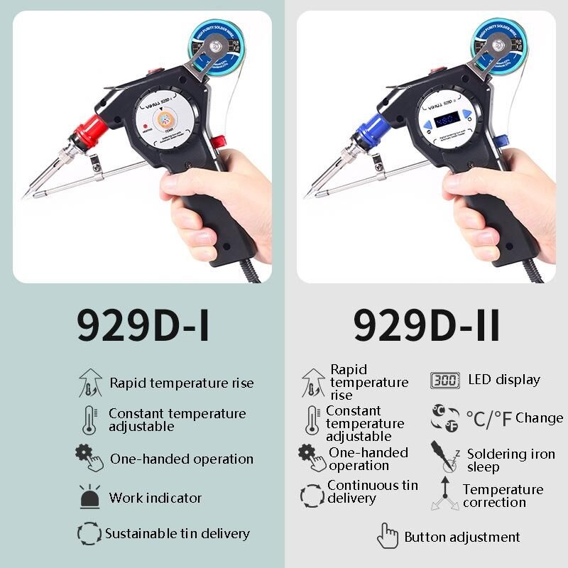 7. Function: 929D-I (rapid heating, adjustable constant temperature, one-handed operation, working indicator, continuous tin delivery), 929D-II (rapid heating, adjustable constant temperature, one-handed operation, working indicator, sustainable Send tin, LED display, Celsius/Fahrenheit conversion, soldering iron dormancy, temperature correction, key adjustment)