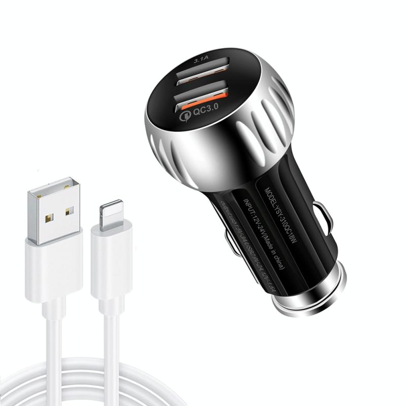 YSY-310QC18W QC3.0 Dual Port USB Car Charger + 3A USB to 8 Pin Data Cable, Cable Length: 1m(Black)