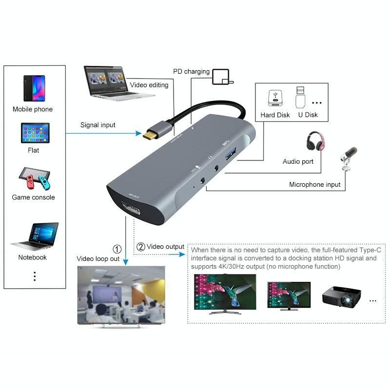 4. Type-C video input terminal can support 4K/30Hz video signal; USB video capture terminal supports 1080P/60Hz, bit rate is 192Mbps; HD HDMI video output terminal can support 4K/30HZ video signal output