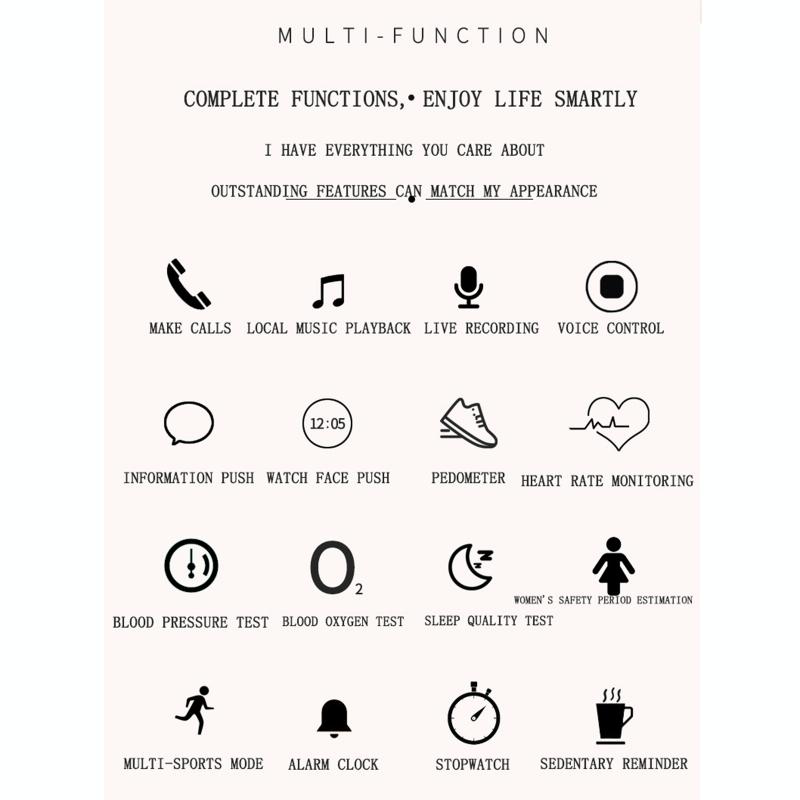 11. Λειτουργίες: κλήσεις, επαφές, ιστορικό κλήσεων, αναπαραγωγή μουσικής, προσαρμοσμένα καντράν, πολυγλωσσία, εγγραφή, φωνητικός έλεγχος, πολλαπλές αθλητικές λειτουργίες, βήματα, παρακολούθηση ύπνου, παρακολούθηση καρδιακού ρυθμού, παρακολούθηση αρτηριακής πίεσης, παρακολούθηση οξυγόνου αίματος, τρέξιμο GPS, ξυπνητήρι, υπενθύμιση καθιστικής ζωής, υπενθύμιση κατανάλωσης νερού, ώθηση μηνυμάτων, υπενθύμιση εισερχόμενων κλήσεων, καιρός, αριθμομηχανή, ξυπνητήρι, χρονόμετρο, αντίστροφη μέτρηση, απομακρυσμένη κάμερα, αναζήτηση τηλεφώνου/αναζήτηση ρυθμίσεων, ανύψωση του καρπού για φωτισμό της οθόνης, ρύθμιση φωτεινότητας, χρόνος φωτεινής οθόνης, επιλογή θέματος, λειτουργία "Μην ενοχλείτε", γυναικείες λειτουργίες (πρόβλεψη περιόδου, περίοδος, ωορρηξία, ημέρα ωορρηξίας, ασφαλής περίοδος) κατά τη διάρκεια της εγκυμοσύνης, κ.λπ.