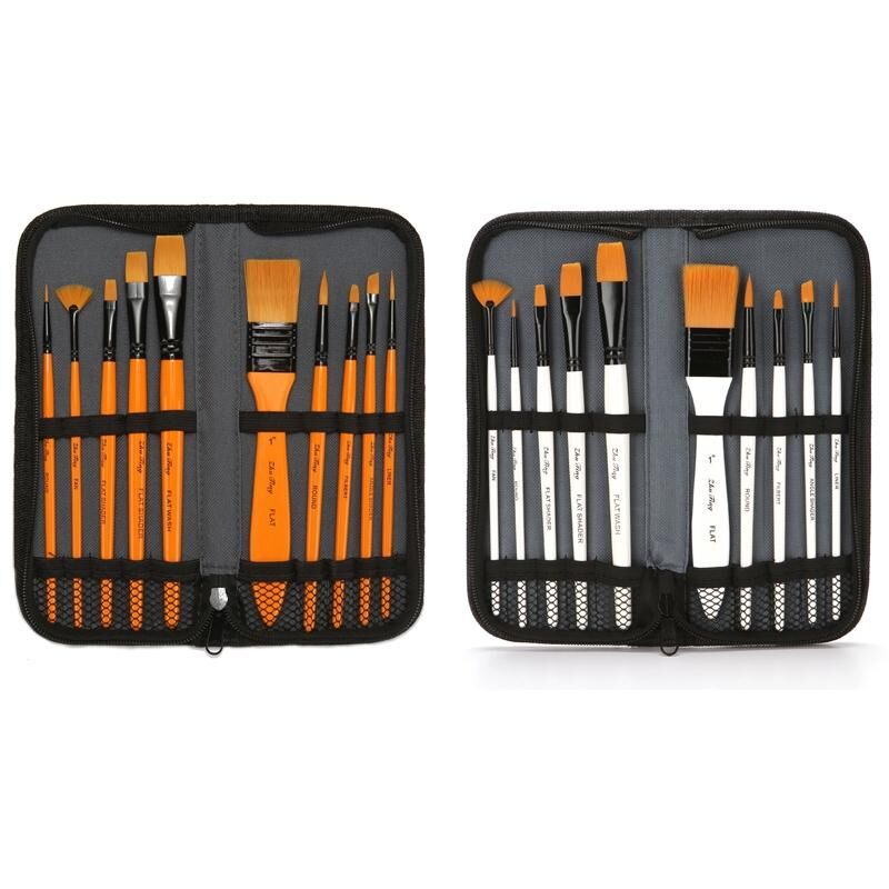 ZHU TING 10 σε 1 Σετ πινέλων ακουαρέλας από ξύλινη ράβδο, νάιλον τρίχα και σανίδα, με σχήμα ανεμιστήρα, με υφασμάτινη τσάντα ZHUTING (Κίτρινη ράβδος) (ZHU TING)