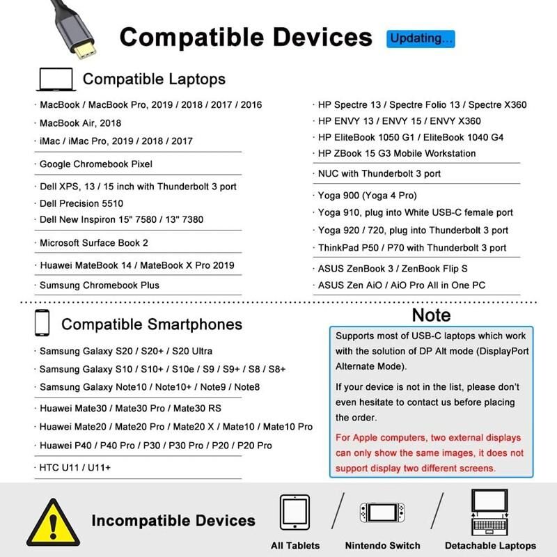2.Compatibility:This dual monitor HDMI adapter is an ideal adapter for Thunderbolt 3 compatible notebooks(NOTED: Please confirm if your device can support Video transfer.)